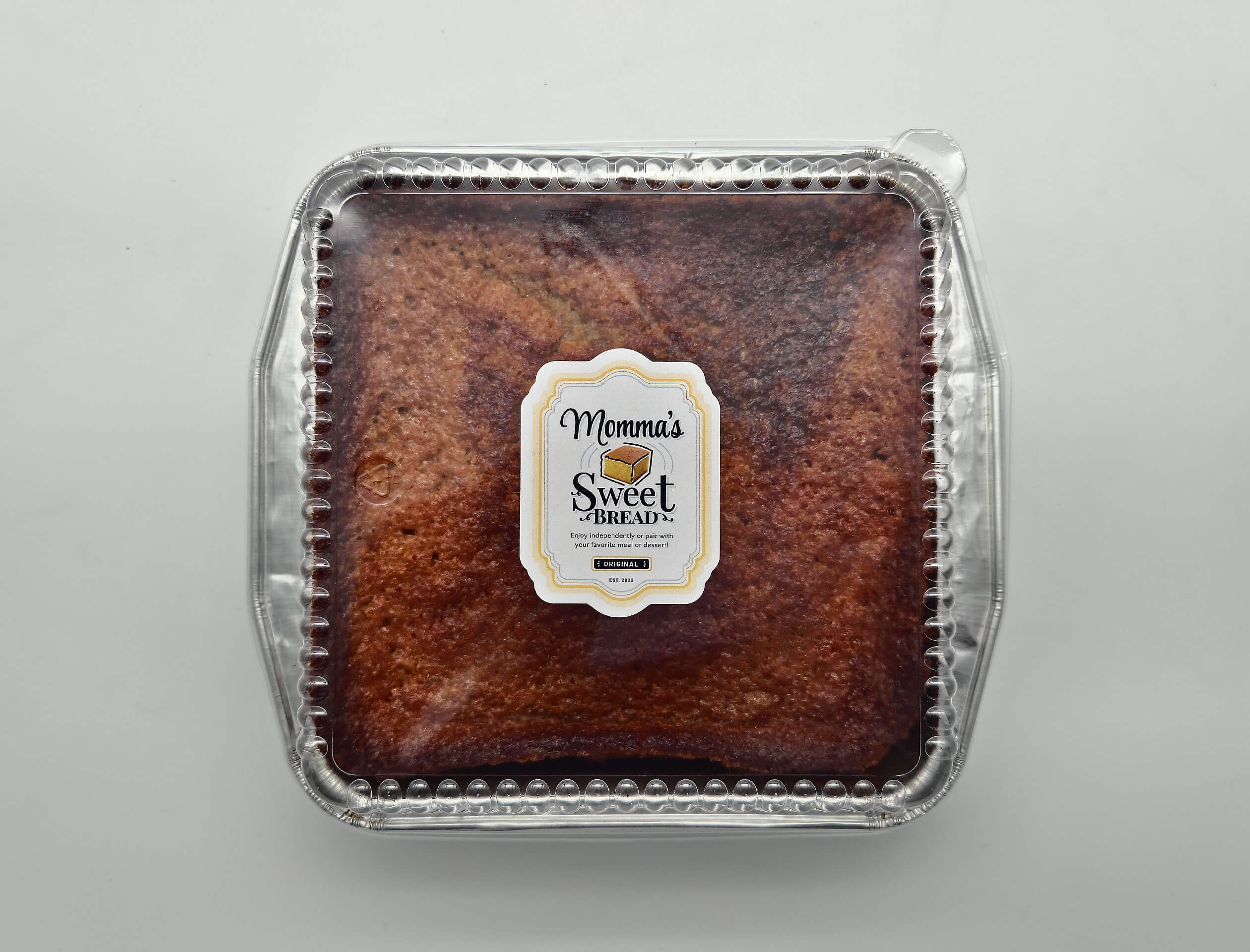 Our small family batch consist of a 8 x 8 x 2.5 inch (with a clear lid) disposable aluminum pan with deliciously handcrafted Momma’s Sweet Bread ℠.